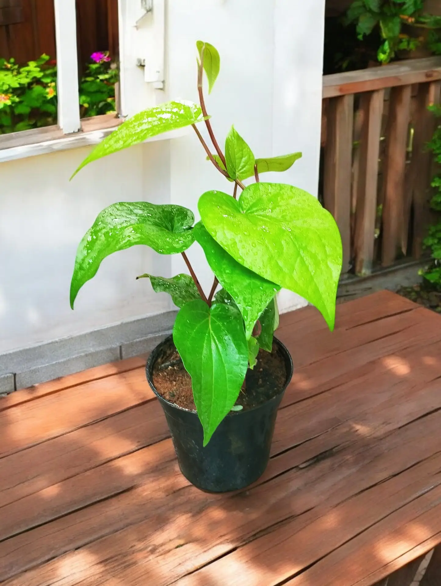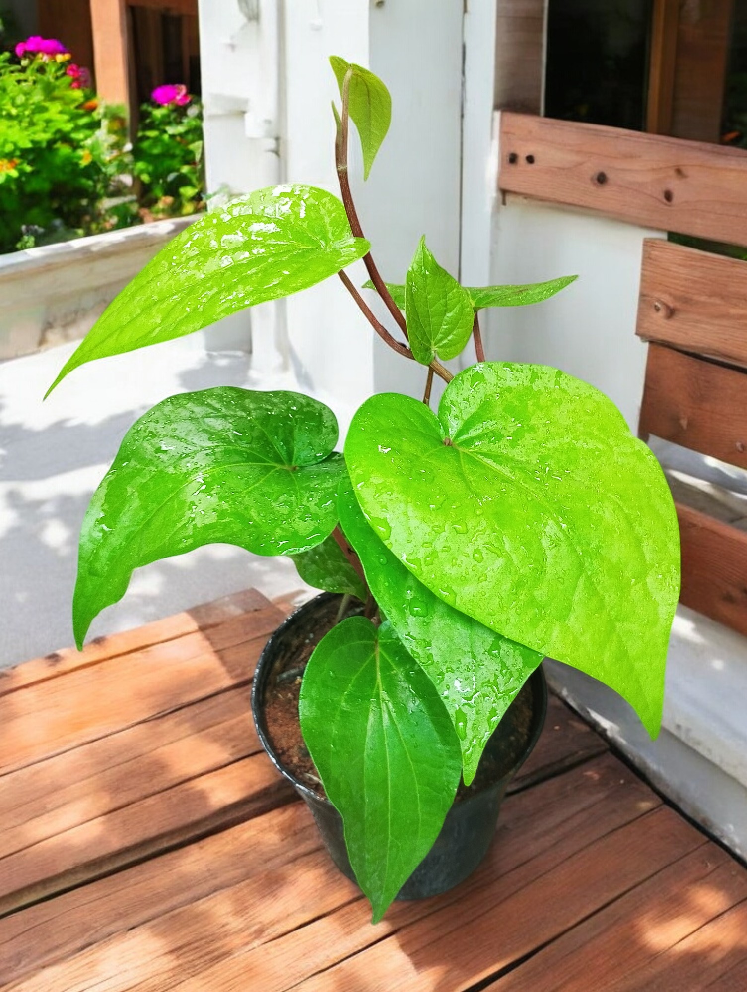 Betel Leaf (Piper betle) is a vine native to Southeast Asia, known for its heart-shaped leaves. When trained to grow on a moss stick, it creates a beautiful and functional vertical garden feature. Betel leaf is often grown for culinary, medicinal, or ornamental purposes.