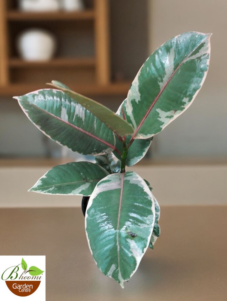 Rubber Variegated or Ficus elastica Ruby is a variegated version of the Ficus Burgundy. In some, the green is so dark it’s almost black, in others the green is more, well, green. Ficus elastica ‘Ruby’ displays beautiful tricolor variegation on dark rubber tree leaves in a gorgeous patchwork of cream, pink and bronzed green. Can develop into a tall upright tree with age. Rubber trees are an easy care house plant or Summer patio plant. Plant in a roomy pot using a well-drained, humus-rich soil. Water moderately, drying slightly in between applications. Protect from frost!