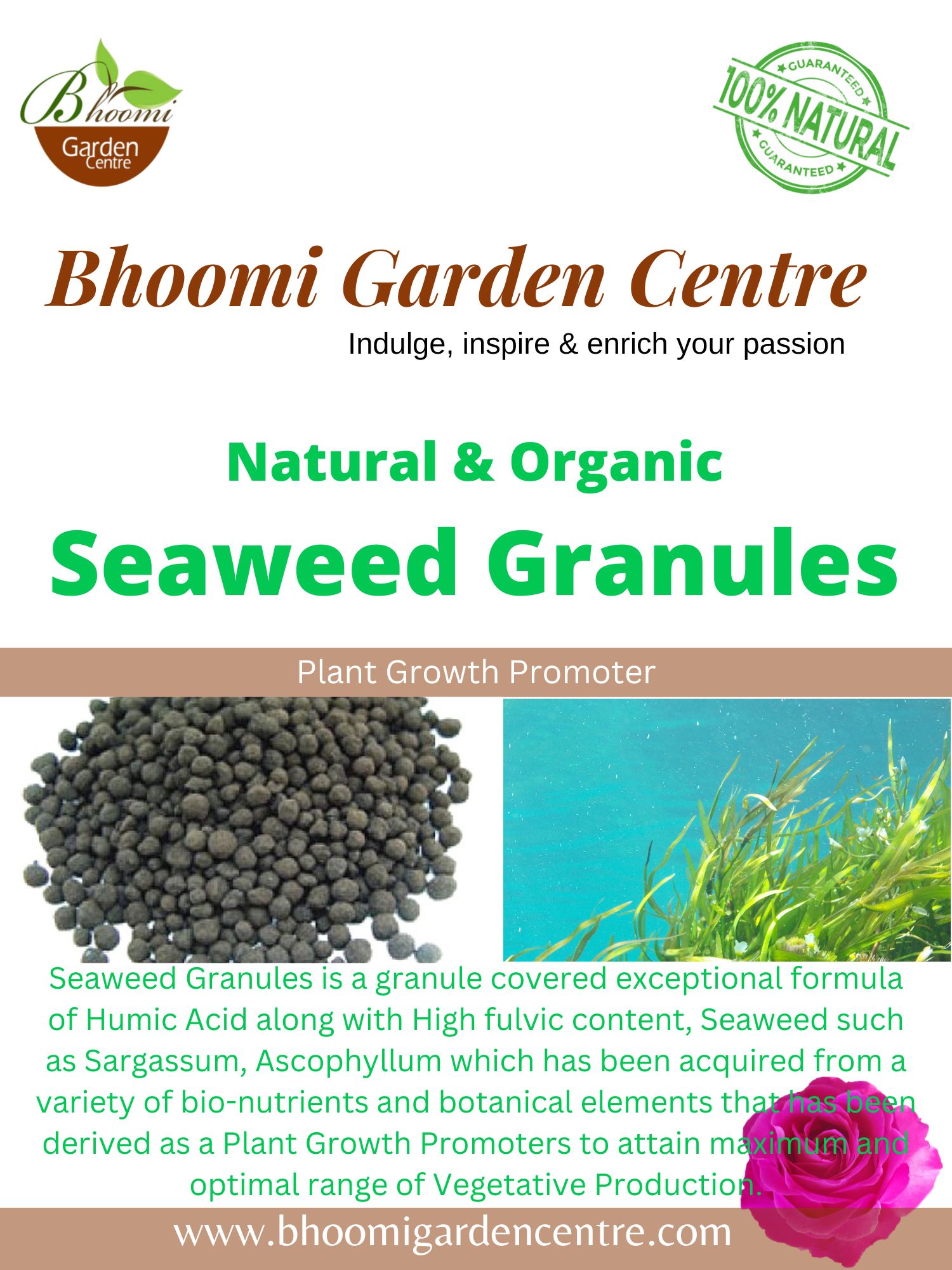 The Advantages of Seaweed granules :- Increases and stimulates beneficial microorganisms in the soil. Improves soil structure & helps to increase nutrient uptake, Helps plants cope with various stress, such as heat, drought and frost. Promotes seed germination and reduces transplant shock. Stimulates root development and promotes vigorous flowering and fruiting. Suitable for Indoor/Outdoor plants. Over 60 naturally occurring macro and micronutrients Activates soil microbial population and improves soil health.